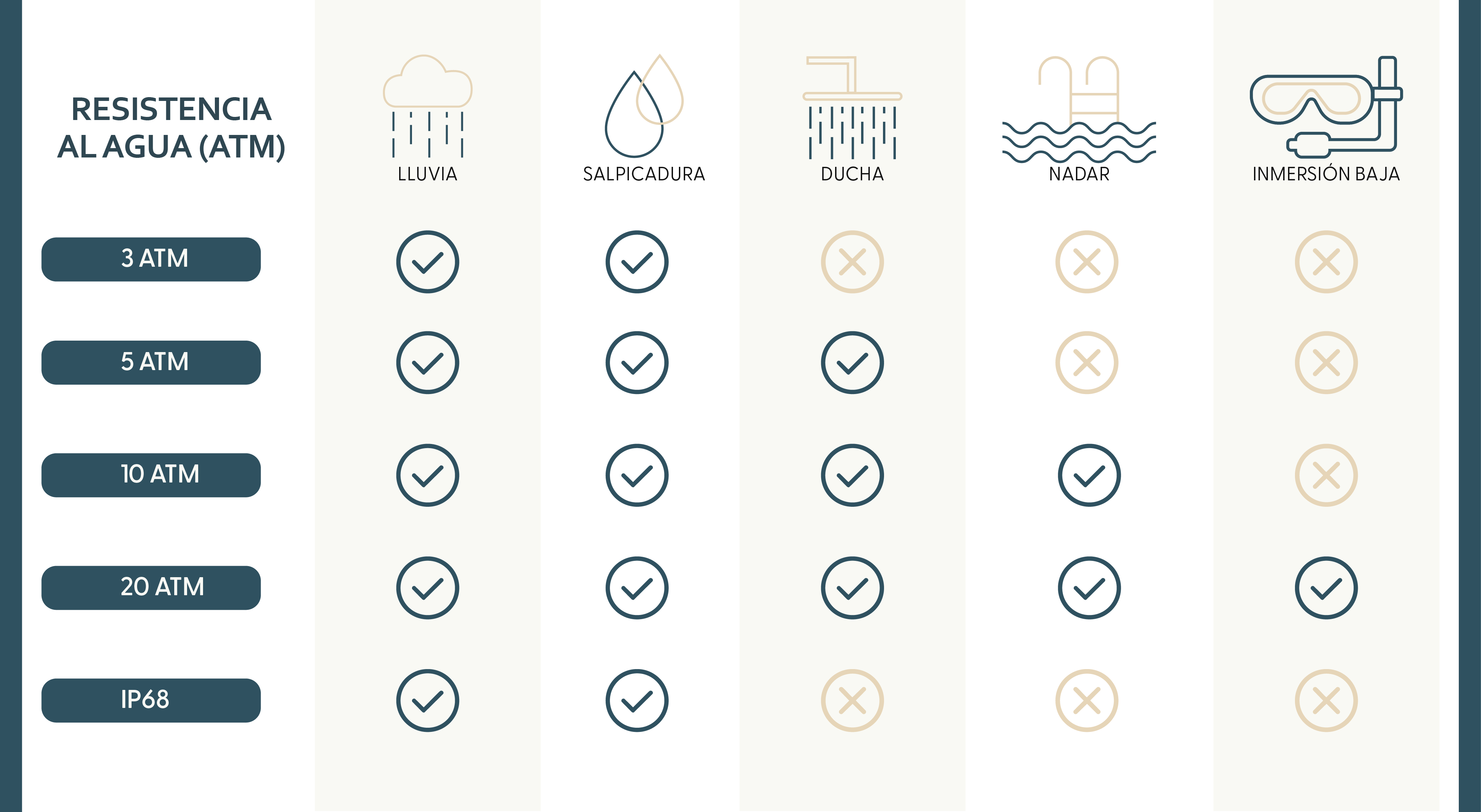 - Contacto con el agua: debes revisar la resistencia que maneja tu reloj y evitar el contacto con el agua si no es resistente. En las descripciones del producto puedes ver la resistencia de cada reloj.